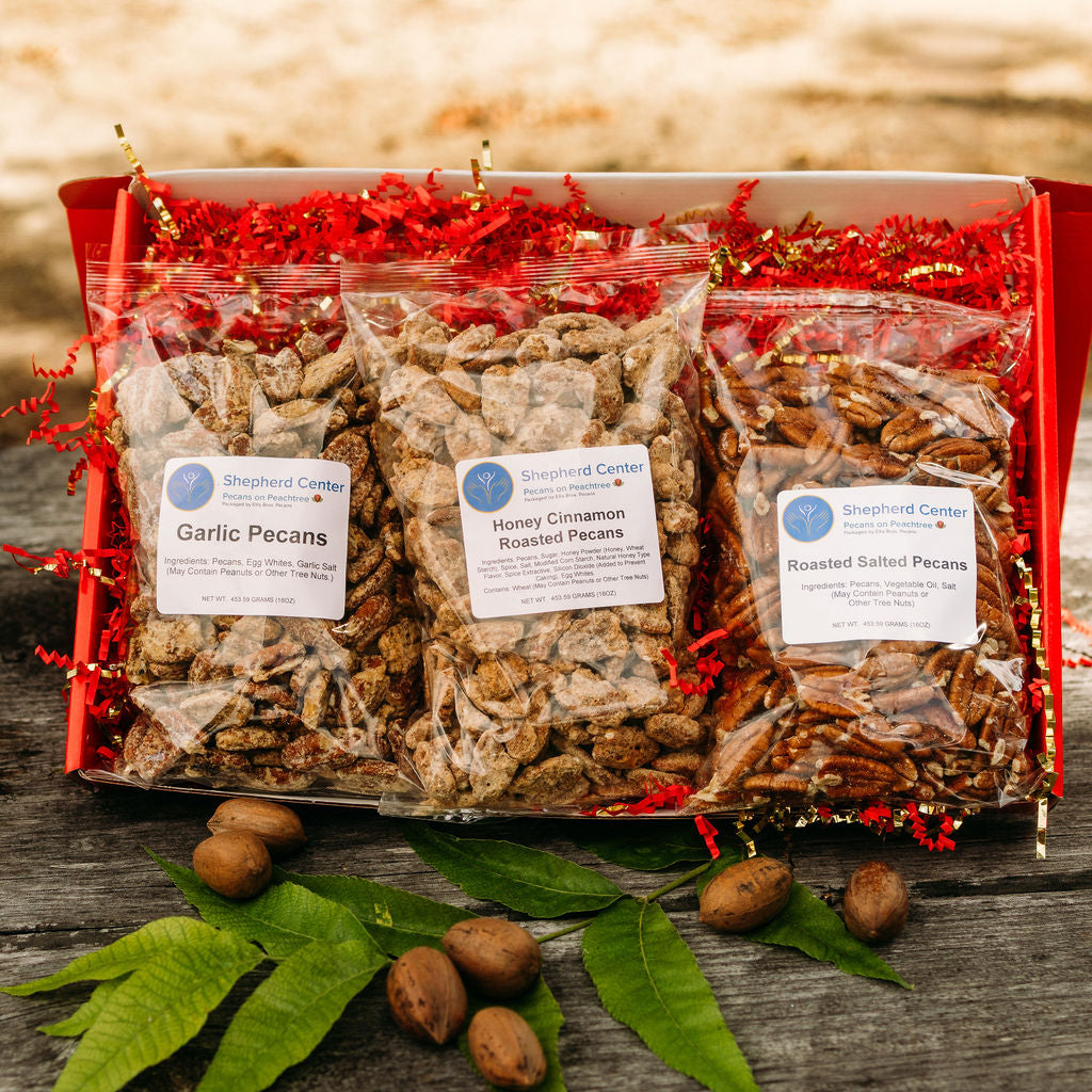 Choose three bags of Flavored Pecans to create your own Shepherd Sampler. Choose from Praline Crunch Pecans, Honey Cinnamon Roasted Pecans, Sweet Heat Pecans, Spiced Pecans, Garlic Pecans and Roasted Salted Pecans.